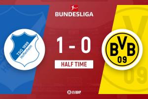 第38分钟,霍村获得点球!克拉马里奇右路弧顶内切打门打在滑到的聚勒手上,裁判经过VAR回放判罚点球,克拉马里奇主罚点球破门,霍芬海姆1-0多特。↓